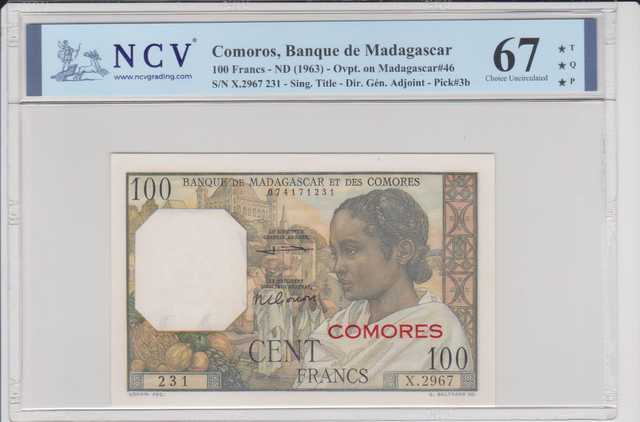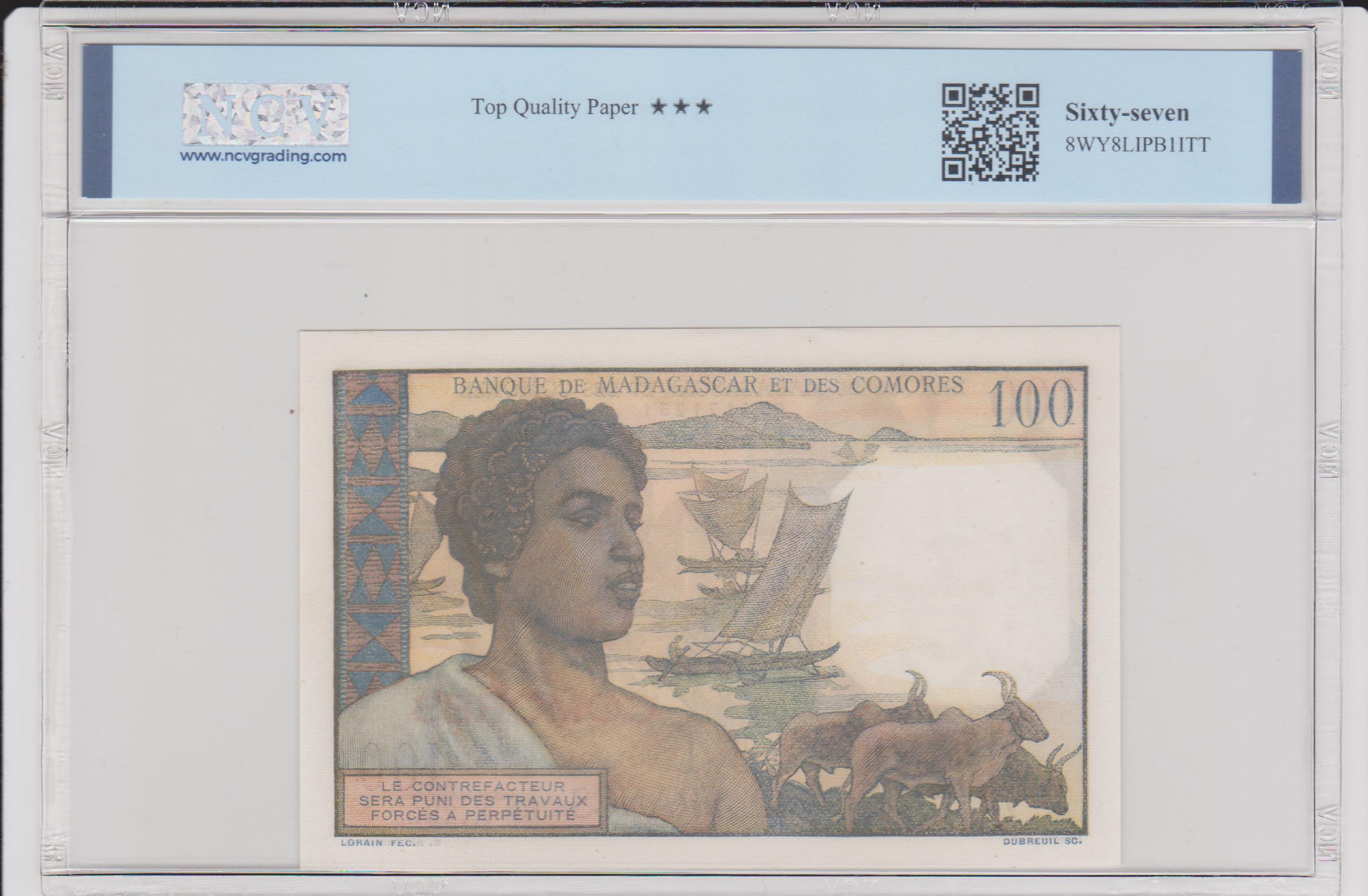 100 francos – ND 1963. Ovpt. on Madagascar.