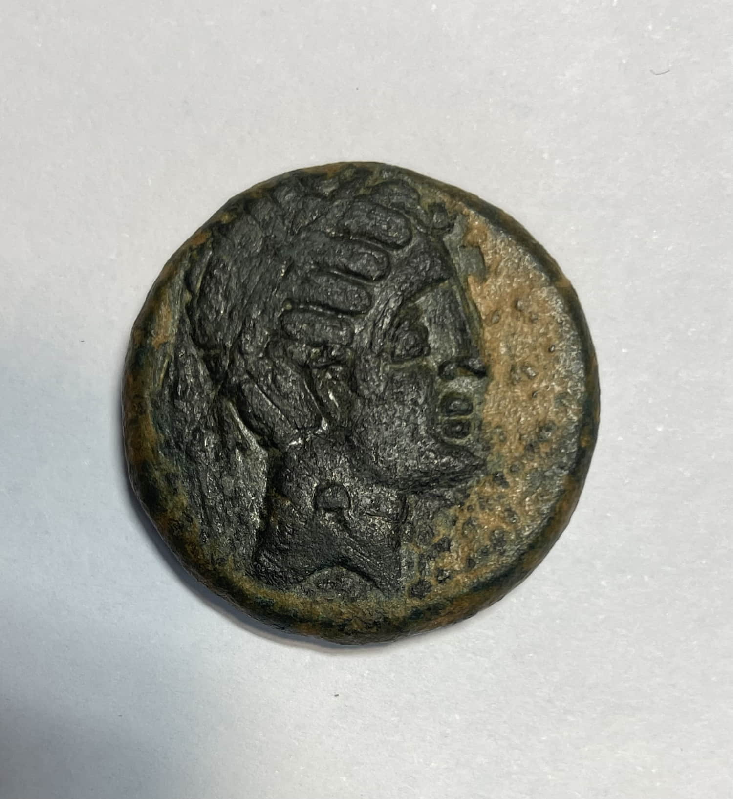Anverso: Cabeza viril diademada a derecha con infulas,detrás palma.