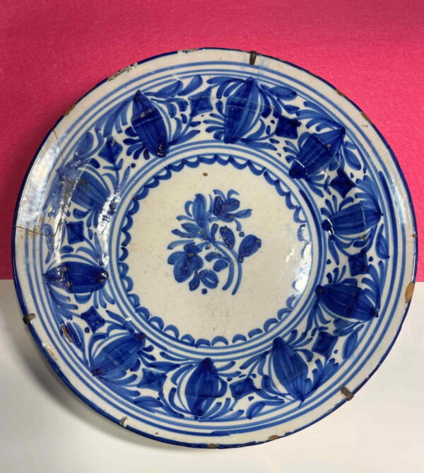 Una de las perduraciones de la tradición de la antigua cerámica barroca de Manises a lo largo del siglo XIX es el popular motivo del Pardalot, que se representa ahora en policromía como en esta fuente de Manises marcada V.M.D. (Vicente Martínez Díez) a final del siglo XIX.