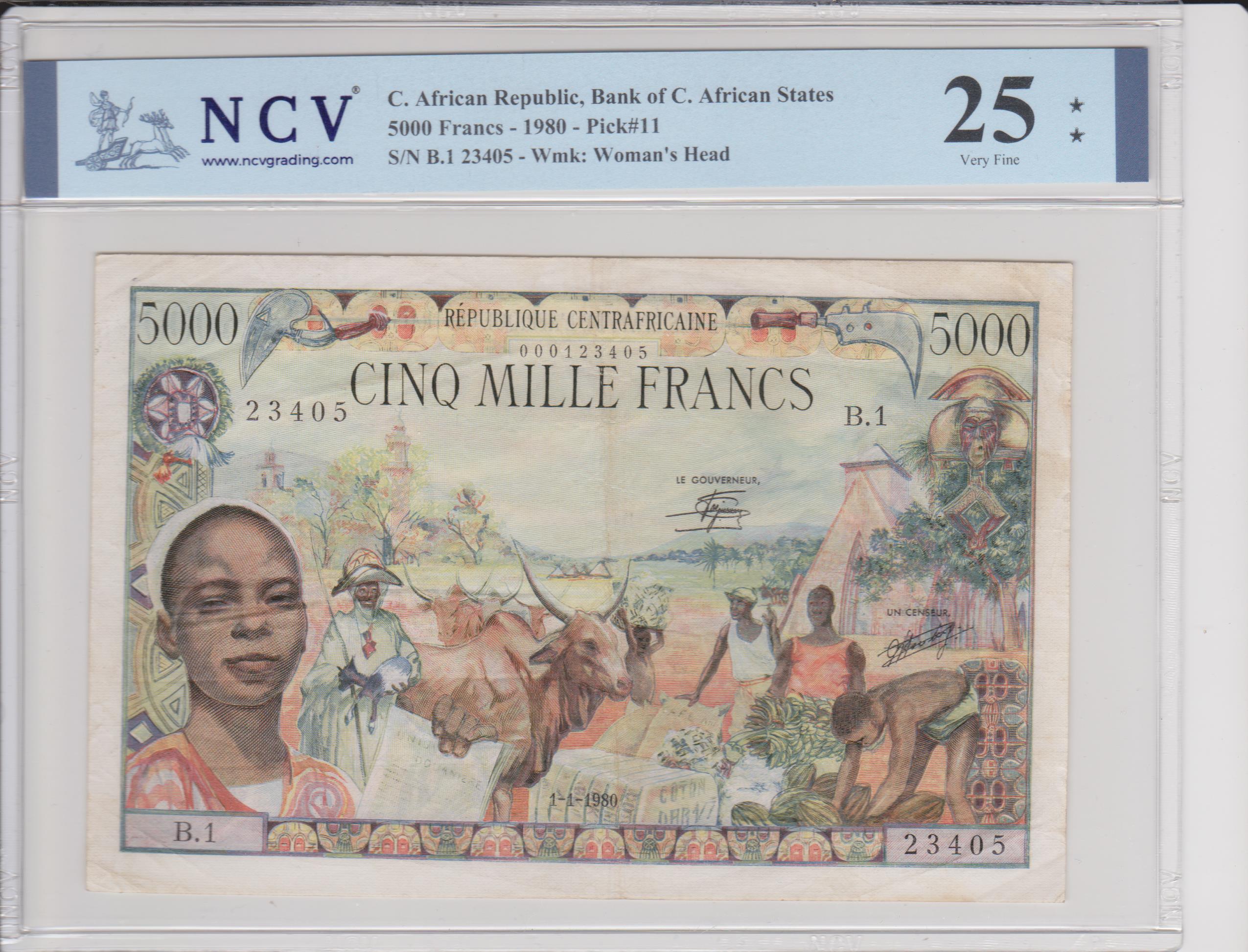 República Centroafricana. Banco de los Estados de África Central. Emisiones 1980-1984 . Obra de Pierrette Lambert y grabado de Marliat para el anverso y de Poilliot para el reverso. Fecha: 1-1-1980 . Dimensiones: 172 x 111 mm. Imprenta: Banco de Francia. Sin hilo de seguridad. Marca de agua: Rostro de una joven africana. Anverso y reverso: Impresión multicolor . Descripción del anverso: Texto en francés: “RÉPUBLIQUE CENTRAFRICAINE”. El valor en cifras está impreso en gris oscuro sobre un fondo de cielo. La numeración, el valor en letras y las firmas están impresos en negro . Marco decorado con motivos coloridos. A la izquierda, un retrato de un niño con un papel en la mano que lleva el nombre de la «Unión Aduanera». Al fondo, cuatro jóvenes se afanan en preparar mazorcas de cacao, cáscaras de algodón, sacos de café y racimos de plátanos que se extienden por el suelo a la espera de ser embarcados. Al lado, un pastor y su rebaño de vacas. Al fondo, una vista de la Basílica de Santa Ana de Brazzaville, un minarete y un pueblo de chozas en la campiña africana. Una única combinación de firmas impresas en negro: «Le Gouverneur (El Gobernador)», Casimir Marie-Ange Oyé-Mba, y «Un Censeur (Auditor)», Jean-François Ntoutoume Emane . Descripción del reverso: Texto en francés: «BANCO DE LOS ESTADOS DE ÁFRICA CENTRAL». El reverso simboliza tanto la tradición con una estatuilla tribal de madera tallada como el desarrollo industrial de los Estados de África Ecuatorial, simbolizado por los modernos medios de transporte (barco, avión, tren o tractor) e infraestructuras (puente, puerto comercial y línea eléctrica de alta tensión), bajo la mirada benévola de un anciano sabio fumando su pipa.